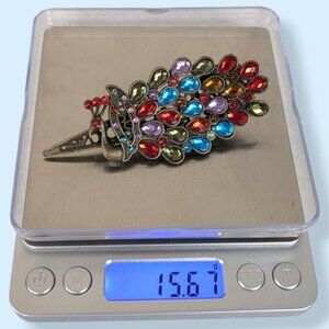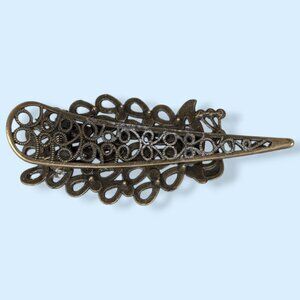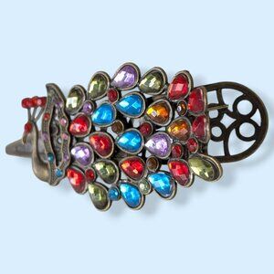 This hair clip is made of a gold/bronze tone metal and has a simple spring-loaded clip with several teeth on the upper side. The clip features a peacock with a red eye and a big tail full of colourful (plastic) faceted stones. The clip is eye catching and has some wear, but no issues affecting wearability. I believe all the stones are accounted for.