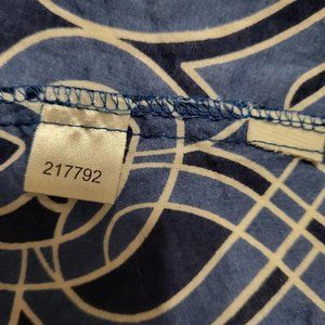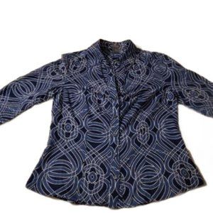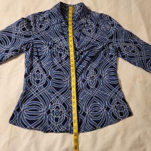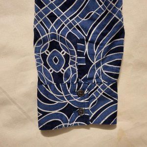 Collared shirt with bracelet length, cuffed sleeves in pretty, fun print.
