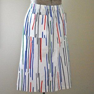 This colourful patterned skirt would be a fun substitute for shorts this summer! It is a mid-length skirt has two pockets in the front and is equipped with an elastic waist for comfort.