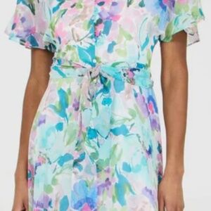Gorgeous abstract floral fully lined dress with flutter sleeves and handkerchief hemline.