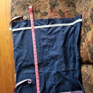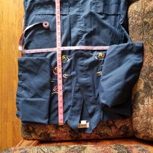 Colourful Chinese dragon and clouds embroidered on a navy blue robe/dressing gown, 2 patch front-pockets, wide 3/4 length sleeves, summer, light weight, thin material, polyester/cotton, vintage 80s. Embroidery is in great condition, material shows little use, overall good condition, little use, wear shows on belt with crease/fold in it. Photos show condition well, with some lint/fluff that I missed. This was only worn in the summer years ago and has been in a closet since. Size small, S, to medium, M, measurements in inches: pit to pit 20, base 23, length 35.5. Made by Health, cotton 22%, polyester 78%. I hand washed, air dry.