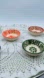 Set of five mini ceramic bowls with vibrant patterns. Features red, green, and blue designs. Great for soy sauce, wasabi or other condiments