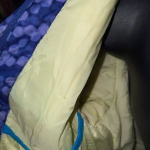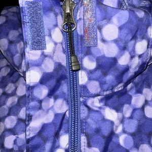 Detailed print work adds art to this pretty, waterproof winter coat for girls, featuring a sleek and durable nylon shell fabric that keeps out the wet, as well as plenty of insulation to keep them cozy through wind, cold, and storm. a pop-color zipper on the chest security pocket adds a vivid splash, while mountain-ready features like an adjustable hood and snap-back powder skirt prepare them for powder days. There are no holes or stains or wear.