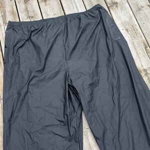 Great quality black rain pants in excellent condition. Snaps at the bottom of the legs to taper if needed. Has two side pockets.