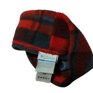 Warm fleece beanie. Red and grey plaid pattern. Columbia brand. Size L/XL. Soft and comfortable. Perfect for cold weather.