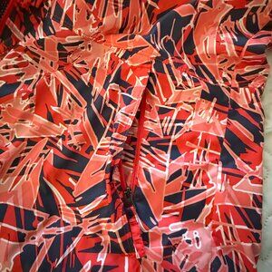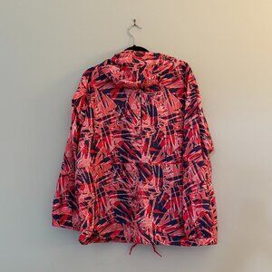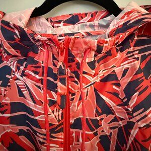 Lightweight windbreaker in shades of reddish pink and navy with white