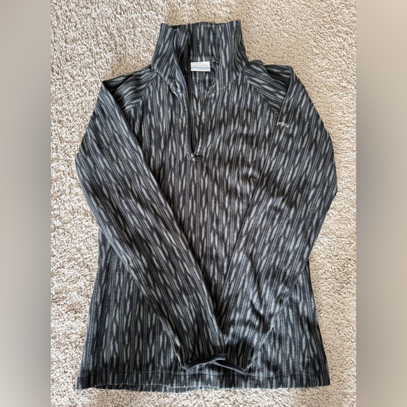 Columbia half-zip pullover with a stylish gray pattern. Ideal as an underlayer for skiing or other outdoor activities. EUC.