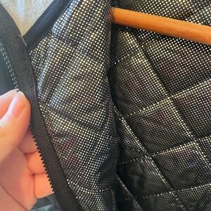 Features a black quilted front and back with gray sleeves and side panels. Lightweight and perfect for outdoor activities or everyday wear.