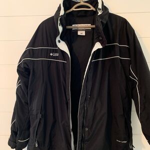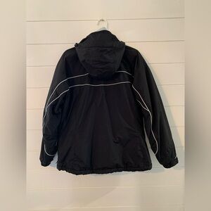 Look effortlessly fashionable with the Columbia jacket with hideaway hood and light blue trimmings.