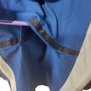 Men’s medium windbreaker jacket from Columbia Sportswear Company in good used condition. It features a navy blue and gray color scheme, with black patterned bands across the chest and forearms.