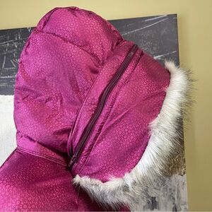 Stylish and bright winter jacket in dark raspberry dotted print will keep you cozy and warm. Features a faux fur detachable trim on the hood, hood is also detachable and filled with responsible down. This jacket has an inside zipped pocket as well as zipped exterior pockets. Brand new with tags.