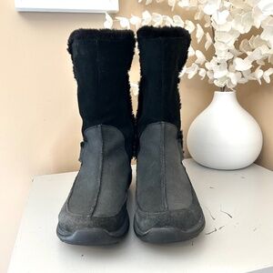 Columbia Winter Mid Calf Boot . Style is Delancey BL2275 in Black Suede. Water resistant. It has footbed which is designed with Contour Comfort™ 1D and AgION® antimicrobial technology which fights against bacteria and odor. Its midsole is molded with shock absorbing Techlite™. The outsole is Omni-Grip® rubber which provides maximum traction and anti-marking properties. Lined with Warm Polyester Sherpa Faux Fur. Size 7.