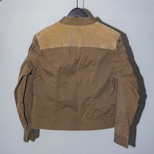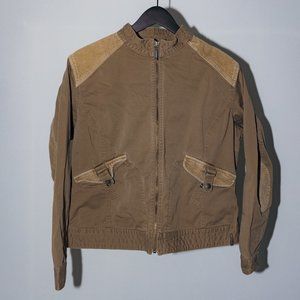 Brown and khaki cropped moto style jacket. Contrast front pockets, elbow patches, and shoulder panel