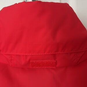 100% nylon jacket with hood that tucks in collar. Velcro around wrists &hood pocket. 2 zippered pockets in front. The jacket is fitted, with 2 darts/pleats in the back.