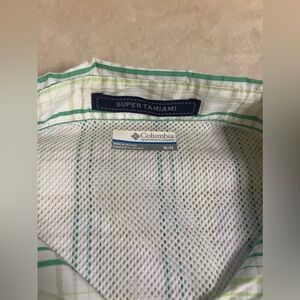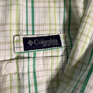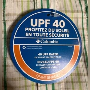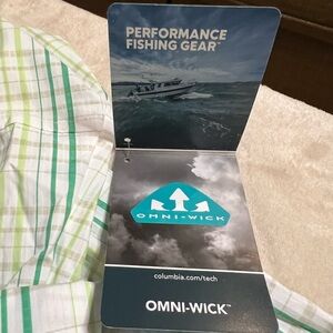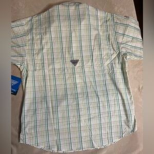 New with tags, Columbia Omni-shade SPF 40 technical shirt, Performance Fishing Gear line. Lightweight and breathable, white and green plaid fabric. Measurements in pictures.