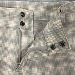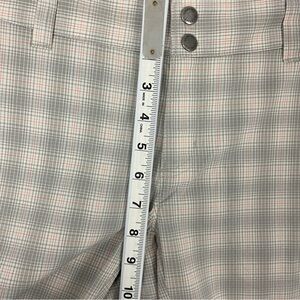 Columbia Omni-wick Walking Shorts. Women's tag size 10. Polyester / cotton blend. Tan and gray plaid. Double snap waistband closure. 4 pockets. Flat front. Zippered hip pocket. Omni-wick - advanced evaporation (quick drying).