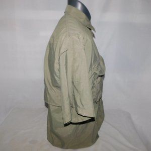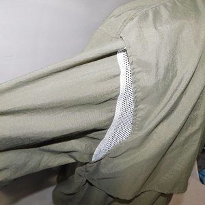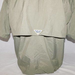 This Men's Medium Columbia PFG Khaki Green Vented Guide Outdoor Fishing Short Sleeve Button Front Shirt is in great clean bright condition. Shirt is 100% Nylon Shell (venting mesh is 100% Polyester ) - Machine washable. Features back venting via sleeves and back slits. 2 Front Chest Multifunction Pockets with hook and loop closures (each pocket has 3 sections to it). Quick dry moisture wicking material. NOTE that this shirt is loose / Oversized to promote airflow - be sure to check measurments