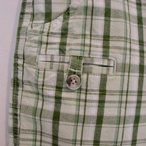 - these shorts feature a plaid pattern in shades of green with a zippered and button front, 2 front slash pockets with a small buttoned pocket, 2 back pockets with belt loops