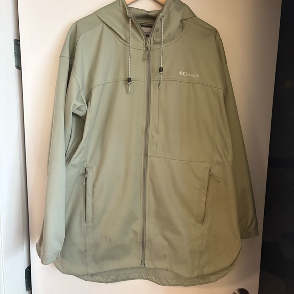 Columbia women's jacket, size XL, water repellent, adjustable hood and waist, some small stains on the bottom (pictured).