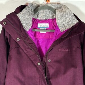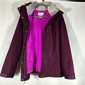 Outer Jacket has 2 zippered pockets and a magnetic snap closure with button as well as the zipper. Detachable hood, with detachable puffer liner that clips in! Inner layer has 2 snap button pockets.