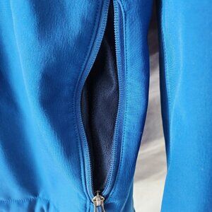 Columbia Sportswear Company men’s hooded jacket in size large, featuring a bold blue color with white zipper accents. This functional and stylish outer layer includes drawcords at both the hood and waist for an adjustable fit, and three secure zipper pockets for your essentials.