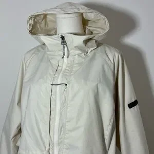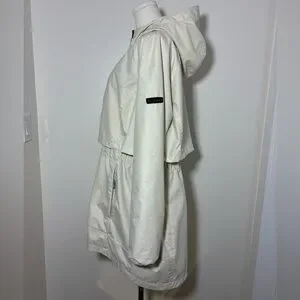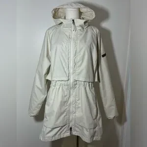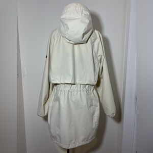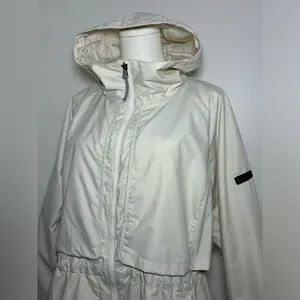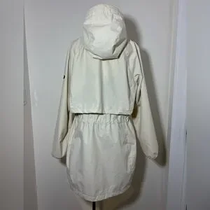 This jacket can be cinched around the waist and also has a hood and hidden pockets throughout