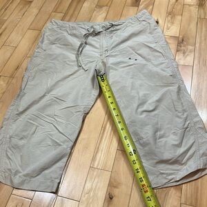 Size large. Columbia capris in a classic tan color. Perfect for casual wear. Very lightweight.