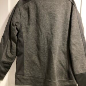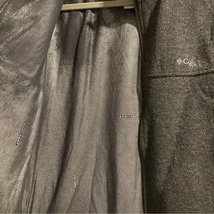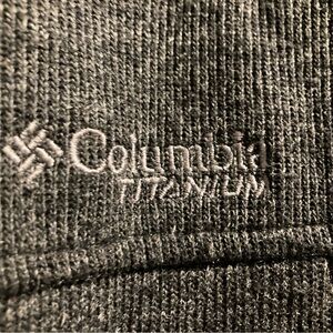 Cozy zip-up Columbia Titanium jacket. Light weight tech outerwear. Charcoal color with sleek, sporty design. Waterproof/windproof. Ribbed texture. Works great with layers.