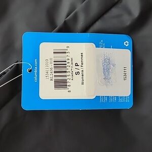 New with tags, Columbia women’s black Arcadi II hooded waterproof lightweight rain jacket with interior mesh lining, size small.
