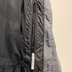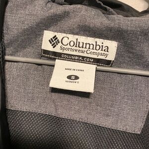 Selling a Columbia Sportswear Company women's packable jacket in size small. It's a stylish gray and black colour. Great for outdoor activities, and it's easy to pack away when not needed! The back is vented to be breathable.