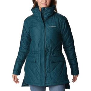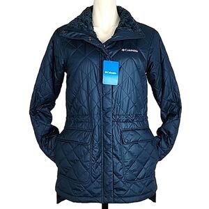 New without tags, Columbia women's jacket quilted water resistant in a teal emerald green and plush faux fur lining, size small.