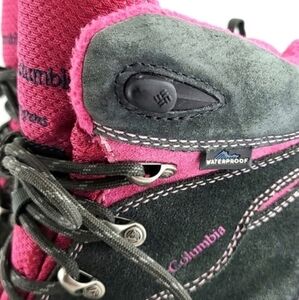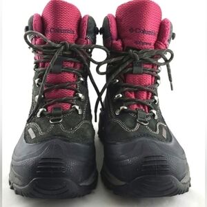 Excellent pre-owned condition, women's Columbia Titanium Ice Crushette waterproof, insulated with Thinsulate short winter boots in black and grey with hot pink detailing, adjustable lace-up and removable insoles, size 7.