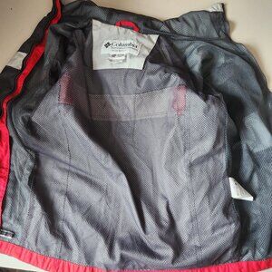Columbia Sportswear Company youth windbreaker in size 10/12. Lightweight and perfect for layering, featuring a grey design with white and red trim. Includes a hood for extra coverage, and all zippers function perfectly. Gently used with minimal signs of wear.