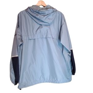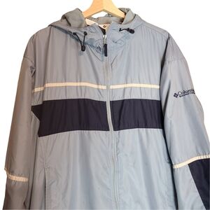 Columbia dark blue,light blue and white, long-sleeved, zip-up,women's jacket. Adjustable hood with strap on the back and elastic band in front, two zippered pockets in the front, Stretchy elastic waistband, open back to reveal mesh lining. Elastic cuffs, in good shape couple stains in the front (see pictures), comfortable, very lightweight.