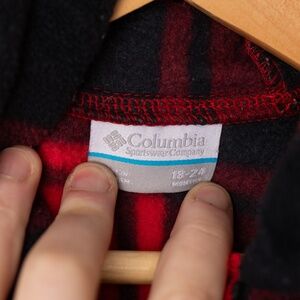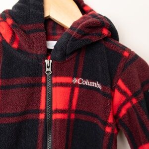 Preloved Columbia brand fleece one piece layer suit in bright red and black buffalo plaid pattern.