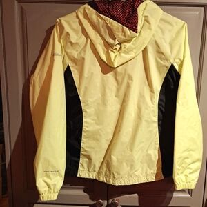 Columbia girls size 14/16 bright yellow & black, water and wind resistant jacket, mesh lining that is black and flourescent orange, 2 front side pockets. zipper and hook n loop closure, packable, no real signs of wear