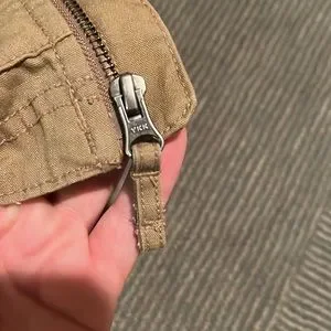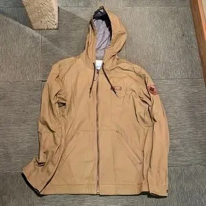 Tan colour with grey hoodie liner. Perfect fall jacket and quite water resistant.