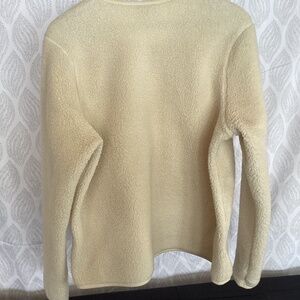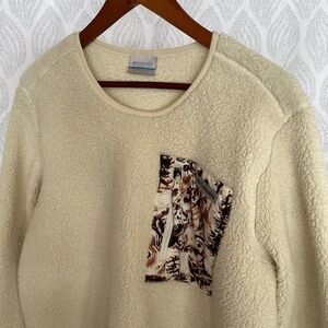 Columbia teddy cream coloured sweater in size X-LARGE. So nice and warm for the outdoors. Zippered front pocket with cute design.