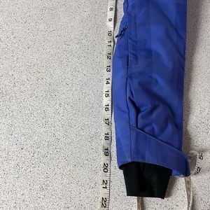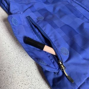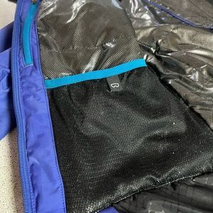 This blue ski or snowboard winter jacket by Columbia has a number of pockets including 2 side, 1 large breast, 1 small below the elbow and 2 inside dedicated to goggles and a phone with an opening for a headphone cord. It has 2 zippered side vents and one of the zippers is missing the pull part but still works fine, see pic. There’s elastic drawstrings on the waist and hood and it has an elastic inner band. It’s waterproof and breathable and the inside is a reflective lining for maximum heat. The colour in the pictures is a bit off the jacket is slightly more purple and less blue.