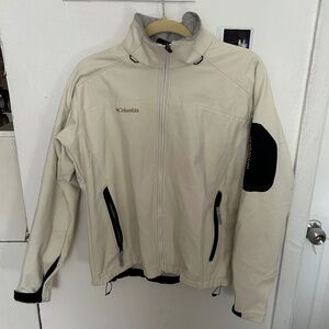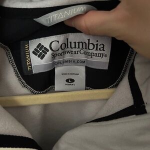 Women's Titanium jacket from Columbia, size large. Perfect condition, worn twice after original purchase (just too big for me, unfortunately). Convenient sleeve pocket, warm and fuzzy on the inside, slight stretch. Doesn't flare out, straight fit throughout.