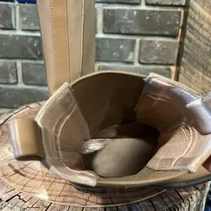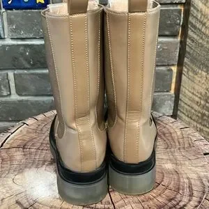 Faux leather tan combat boot / sz 7 / light weight / super comfortable / pull on style / like new / no brand name that I can see