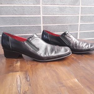 Rarely used black leather Amalfi by Rangoni loafers with a one-inch block heel. Beautiful patent leather detailing on the back, and along the bottom of the entire shoe. The insides and insoles of the shoes are ligned with soft red leather. Luxurious. The shoes are square-toed and fit a narrow size 9.5 foot well. They are in very good used condition. Only selling them because I can't wear heels anymore.