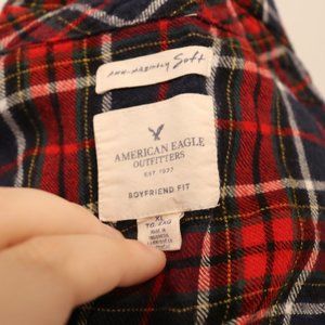 Super comfy American Eagle flannel. Fabric is "Ahhhh-mazingly soft" and fit is "Boyfriend Fit" as well as high-low/shorter in front and long in the back. Sizing is older so a little smaller than a 2020/normal XL. Condition is great, pre-loved, and some pulled threads or scuffed fabric, but overall in great condition (please see photos for these details).