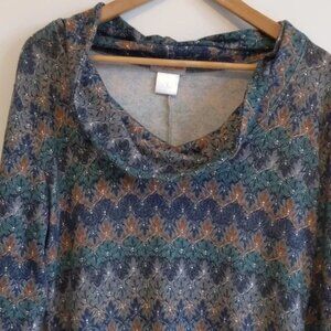 Super comfy multi-colored wide-neck and cowl-neck dress by Berlin designer Mr. and Mrs. Pepper. Fabric is super soft jersey and travels well. Pre-loved and in good condition.