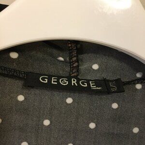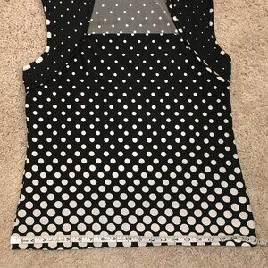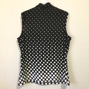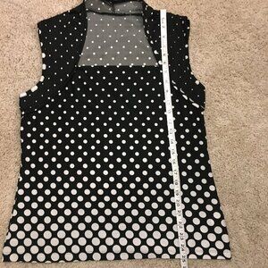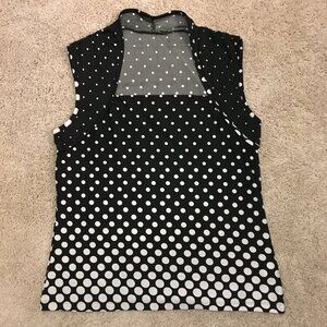 Very good preowned condition, black and white polka dot comic style gradation printed, retro rockabilly, shrugged sleeveless top by George. This is actually pretty cute for George. A mixture of whimsy and gothic. Very interesting cut and very cool.