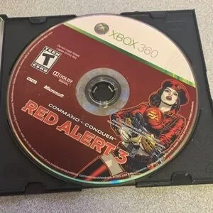 Official Microsoft Xbox 360 game disc with bold red artwork. Features Command & Conquer: Red Alert 3 branding and character illustration. Disc shows Xbox 360 label near the hub. Clear printed logos and title for easy recognition.