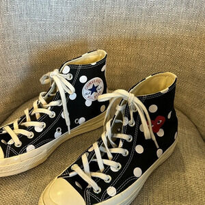 The Comme des Garçons Play x Converse Chuck 70 special edition comes with white polka dots across the upper, while the iconic CDG Play heart logo appears on the lateral side. A white stripe runs down the back of the shoe, while the clean midsole is missing a foxing stripe and the heel boasts a white license plate tag.
