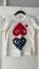White tee with iconic red heart graphic. Classic Comme des Garcons style.