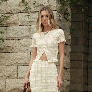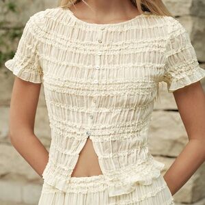 Perfect condition. This elegant cream ruffled top is perfect for any occasion. Its delicate design adds a touch of sophistication to your wardrobe.