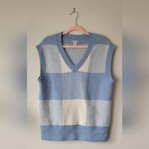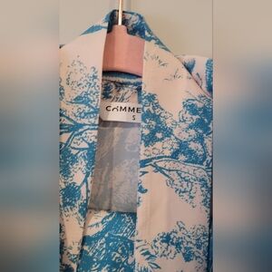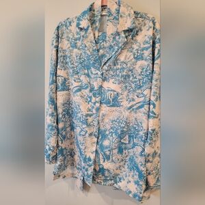 Stylish blue and cream patterned set. Features a belted top and matching pants.